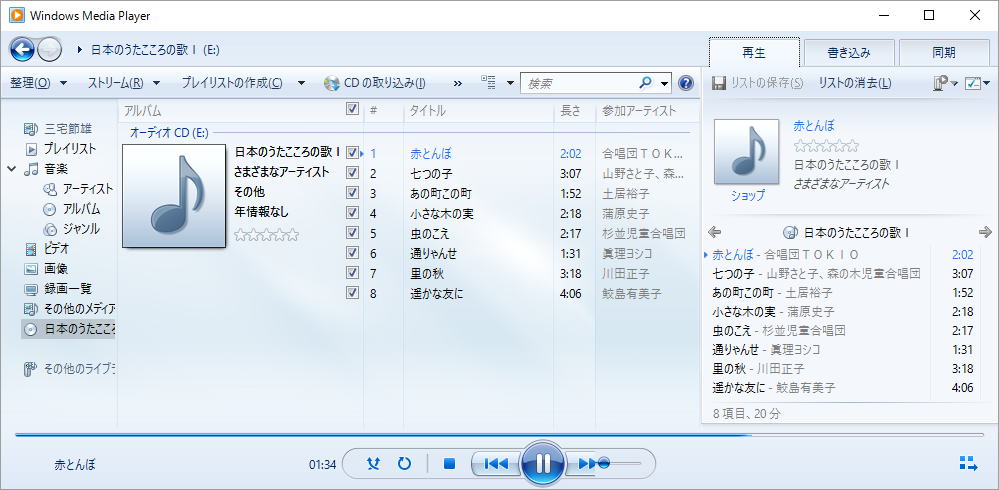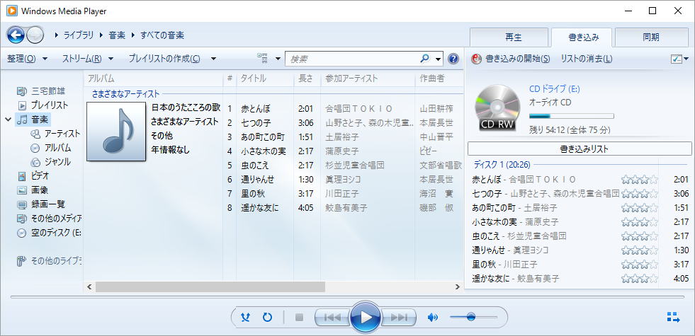 ![]() Windows Media Player を起動してCDを挿入した場合の表示例 ![]() Windows Media Player で新しいCDに音楽を書き込む場合の表示例 |